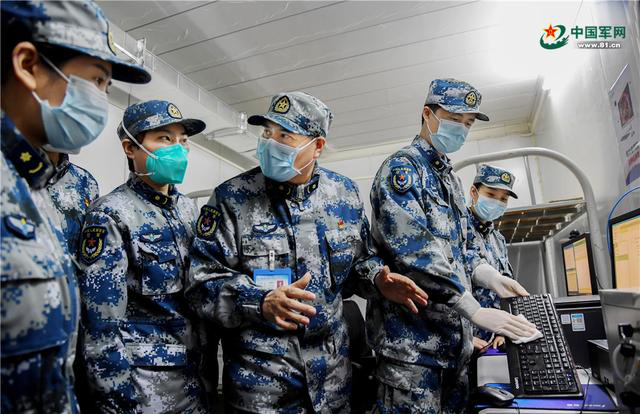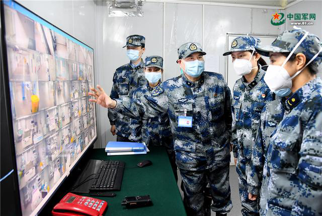 王晓坤(左三)给战友们讲解运用监控督导病区内医护人员穿脱防护装具。