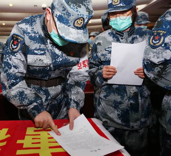 听到了出征召令,文职人员一个个按下鲜红的手印。马瑞娜是呼吸科主治医师,丈夫李敏之前也是军人,是唐都医院神经外科副主任医师。2018年,为响应党中央和中央军委号召,俩人成为一对“军转文”夫妻。她没有忘记自己入伍时的誓言,对丈夫说:“我是呼吸内科医生,这次疫情需要我!”