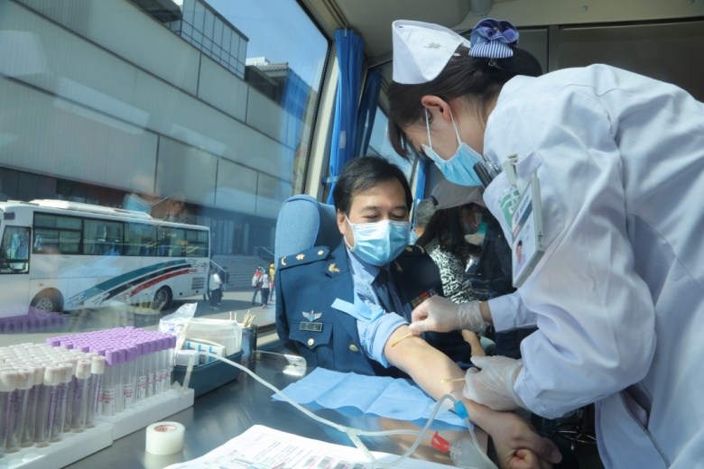 献血车里,市民纷纷挽起袖子,捐献热血爱心。距离上次献血刚好183天间隙,输血科主任尹文再次加入到无偿献血的队伍。