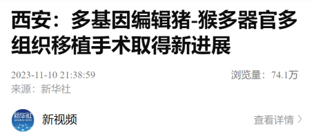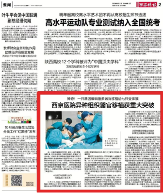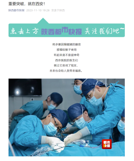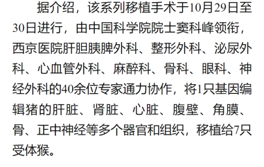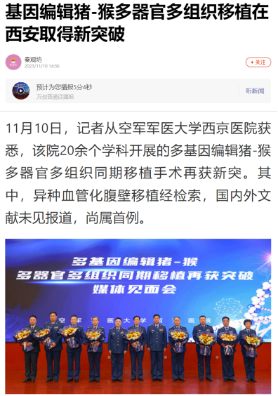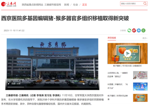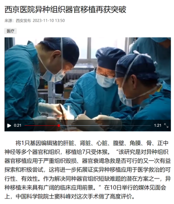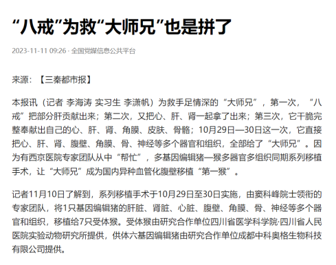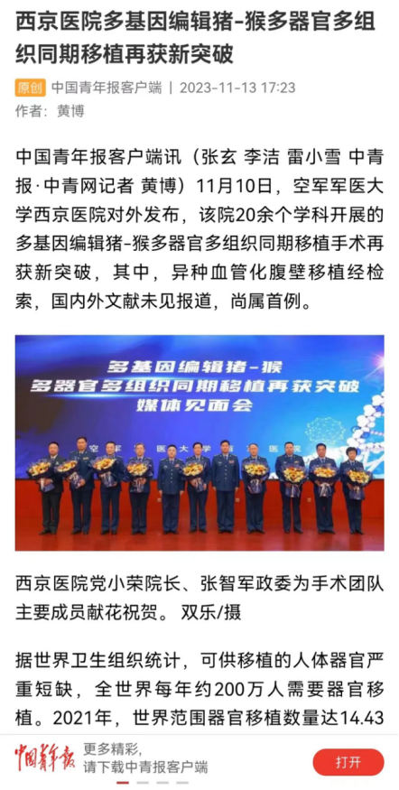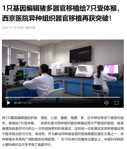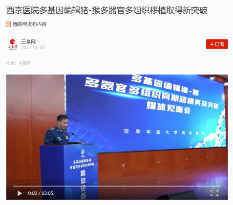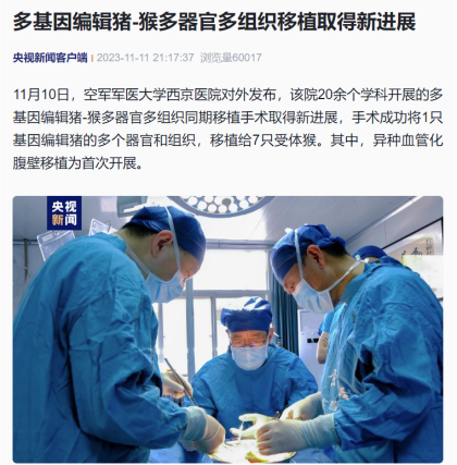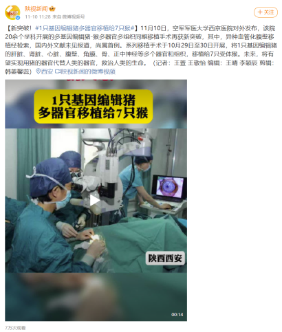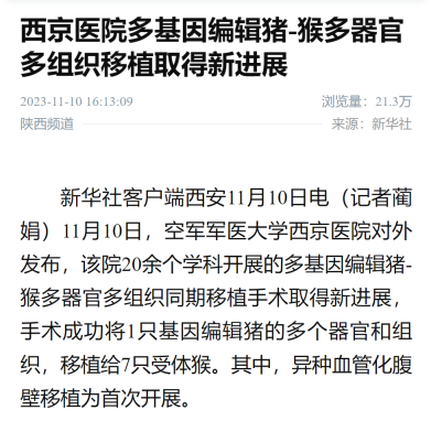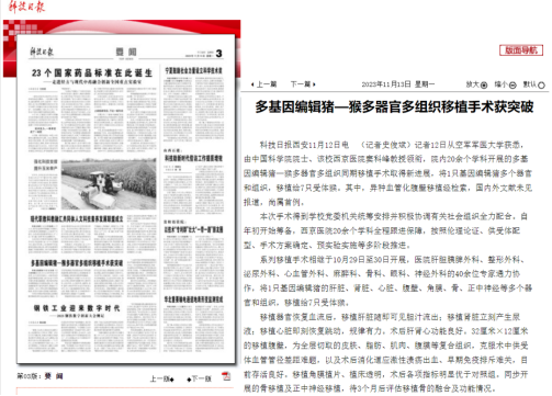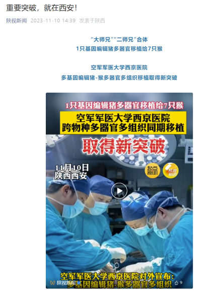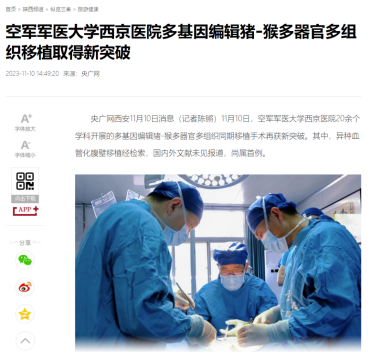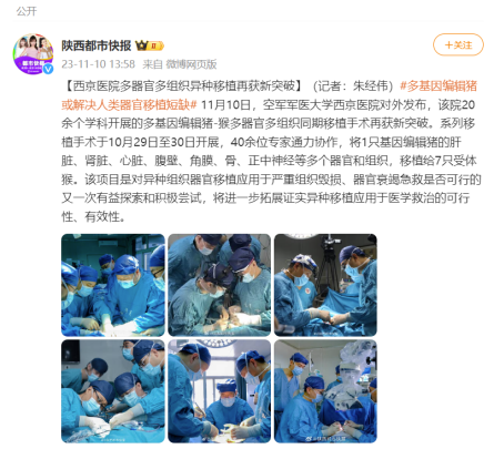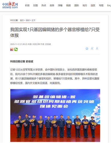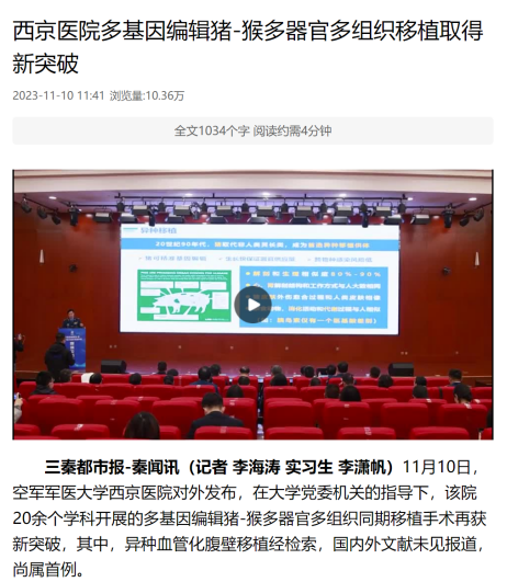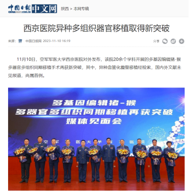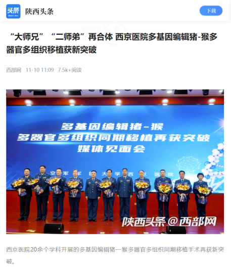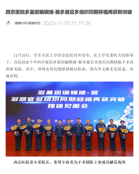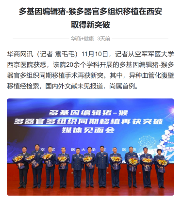 近日,西京医院20余个学科开展的多基因编辑猪-猴多器官多组织同期移植手术再获新突破,其中,异种血管化腹壁移植经检索,国内外文献未见报道,尚属首例,新华社、央视新闻、军事报道、光明日报、科技日报、中国日报等多家主流媒体关注报道。
