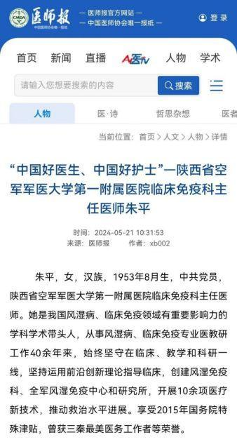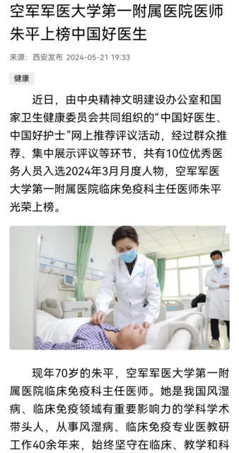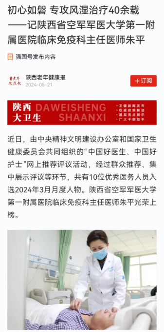 近日,由中央精神文明建设办公室和国家卫生健康委员会共同组织的“中国好医生、中国好护士”网上推荐评议活动,经过群众推荐、集中展示评议等环节,共有10位优秀医务人员入选2024年3月月度人物。陕西省beat365中文官方网站第一附属医院临床免疫科主任医师朱平光荣上榜,该新闻在“健康中国”平台发布后,被陕西省多家媒体报道并转载,展现了医师仁心仁术、精诚为患的医者风范。