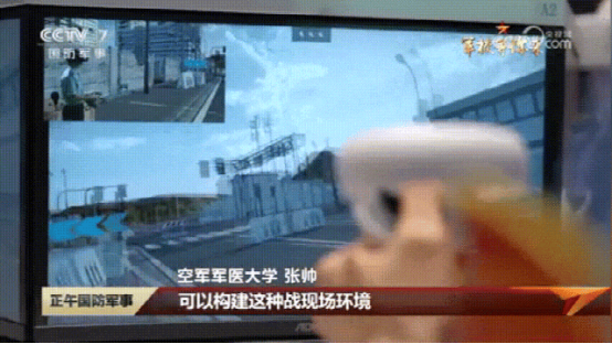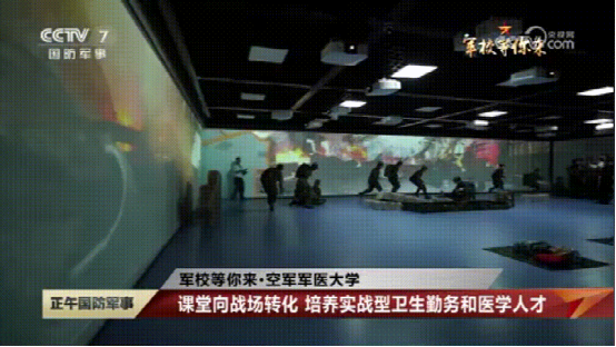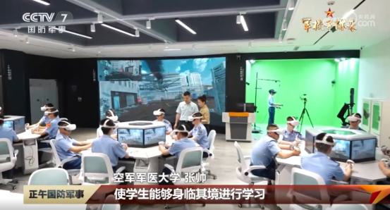 在VR区域,这里模拟的是战场救援,学员正在对伤员进行检查。这个就是XR沉浸式教学体验馆,它集合了VR、AR、MR等多种技术手段,可以构建各种高危、核、化、生以及高污染的难以复现的战现场环境,使学员能够身临其境进行学习。