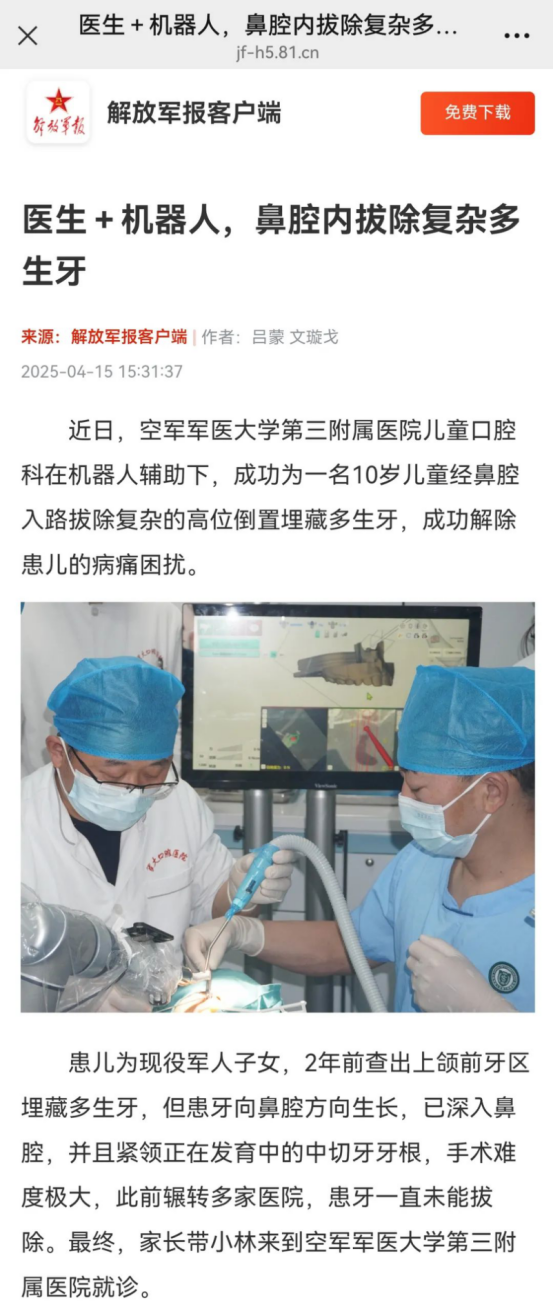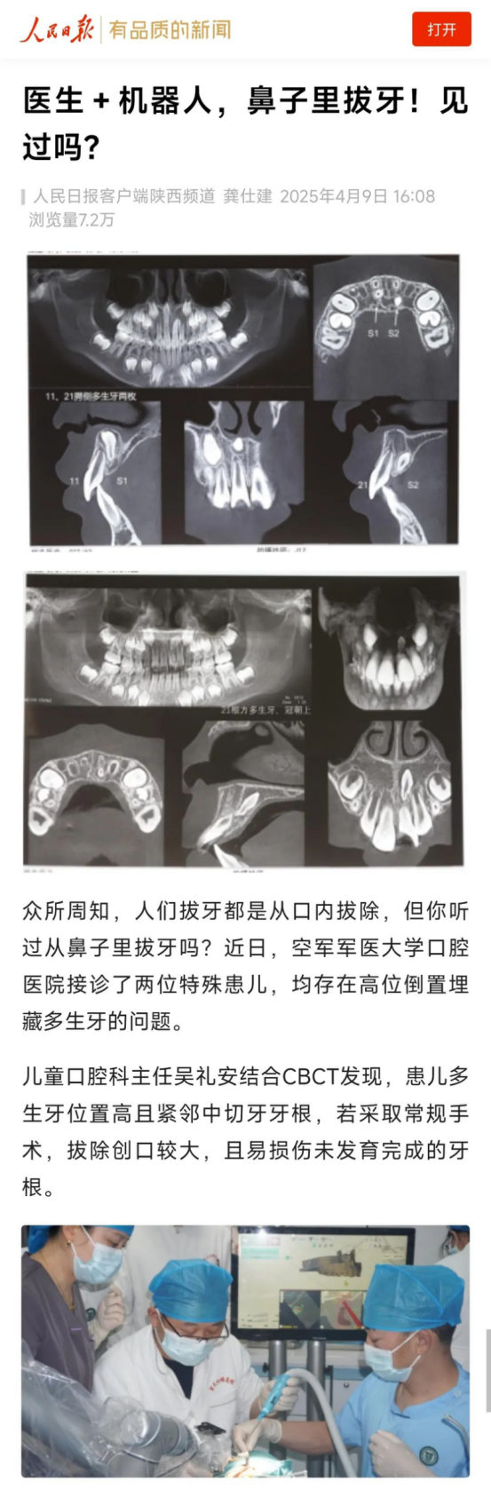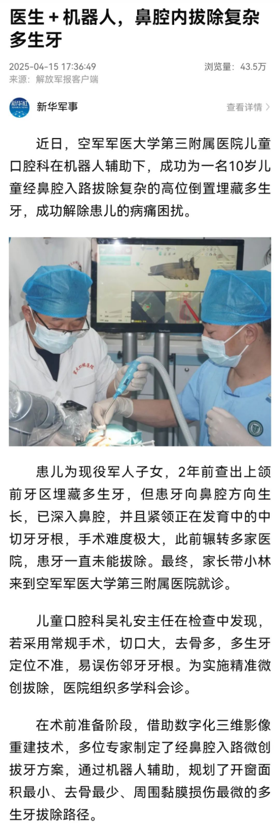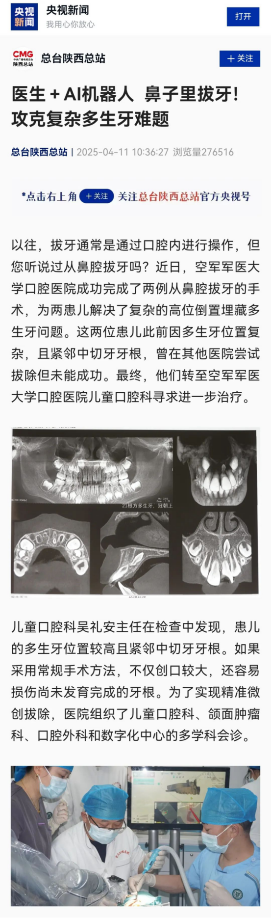 近日,大学口腔医院多学科专家团队联合会诊,使用智能手术机器人系统,在经鼻入路狭窄空间实现精准操作,成功为两名高位倒置埋藏多生牙患儿实施精准微创拔除术。术后复查显示,手术区域愈合良好,多生牙被彻底拔除,且未对中切牙牙根造成损伤,患儿家长对治疗及功能恢复效果非常满意。