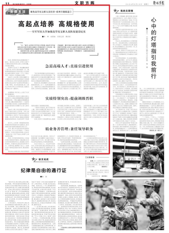 该校领导介绍,近年来,他们坚持高起点培养、高规格使用,大力加强高学历文职人员队伍建设,助力他们跑出岗位成才加速度。截至目前,该校文职人员中,110余人有省级以上重要学术任职,10余人入选空军高层次人才,涌现出中青年科技创新领军人才、国家杰出青年科学基金获得者、长江学者特聘教授、国家科技进步一等奖团队等一大批科技精英和青年才俊。