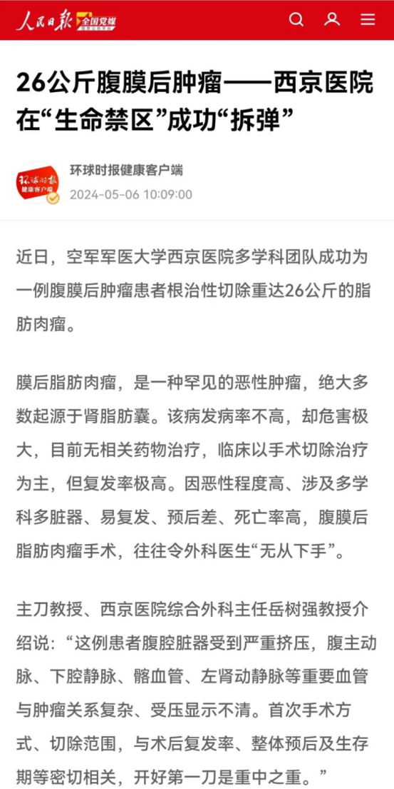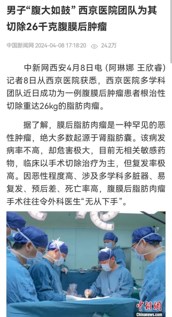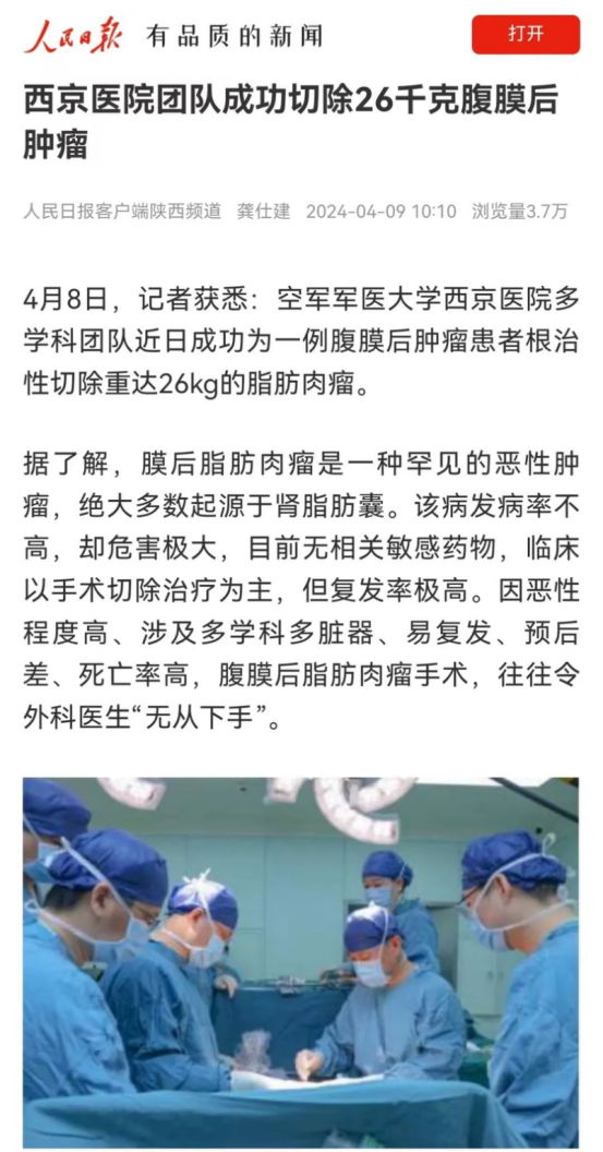 近日,大学西京医院综合外科团队成功实施一例26KG腹膜后巨大肿瘤切除手术。该新闻一经报道,被人民日报、中国新闻网、中国军网等多家媒体关注报道,话题登上微博同城热搜榜NO.3。