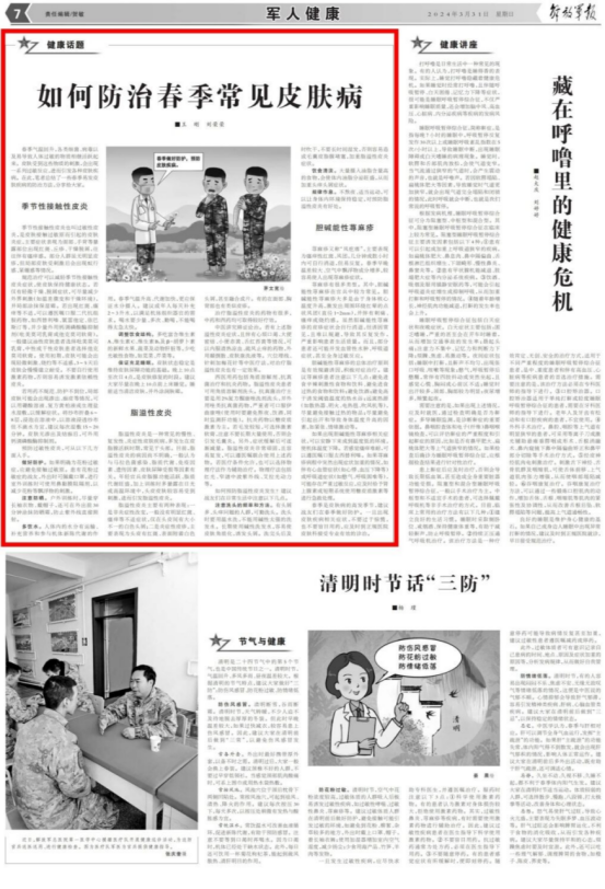 春季是皮肤病的高发季节,建议战友们在春季做好防护。一旦出现皮肤疾病相关症状,不要过于惊慌,也不要盲目用药,应及时到正规医院皮肤科接受专业有效的诊治。