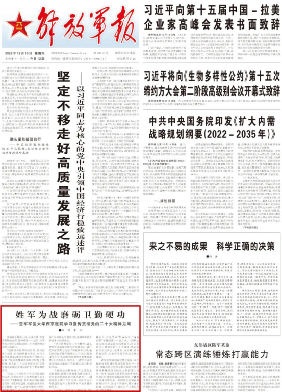 “学习贯彻党的二十大精神,就是要始终秉承救死扶伤的医者初心,紧盯医学前沿聚力攻坚。”该院领导介绍,他们坚持在学懂弄通做实上下功夫,既通过深入学习、深刻领悟激发官兵使命豪情,又学用结合、知行合一,把学习成效逐步转化为推动工作的强大动力和实际行动。