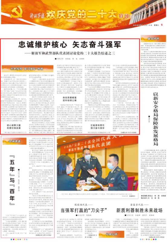 使命扛在肩头,忠诚镌刻战位。“踏上实现第二个百年奋斗目标新的赶考之路,我们要认真学习贯彻党的二十大精神,全面贯彻习近平新时代中国特色社会主义思想和习近平强军思想,开创国防和军队现代化新局面,确保如期实现建军一百年奋斗目标。”代表们誓言如铁。