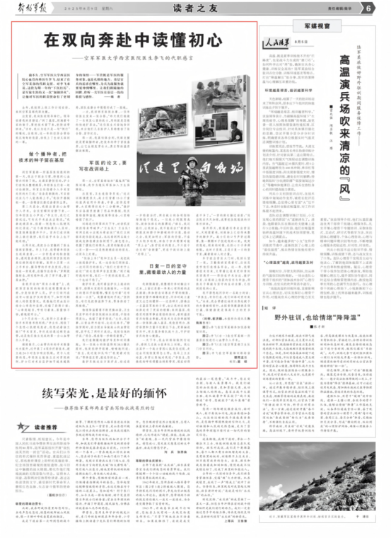 我不禁想起问诊时一名战士的话:“李医生,有你们在,我们训练时更有底气。”未来,我会带着这场双向奔赴赋予的力量继续前行,去探索保健康就是保打赢、保健康就是保战斗力的更多可能。