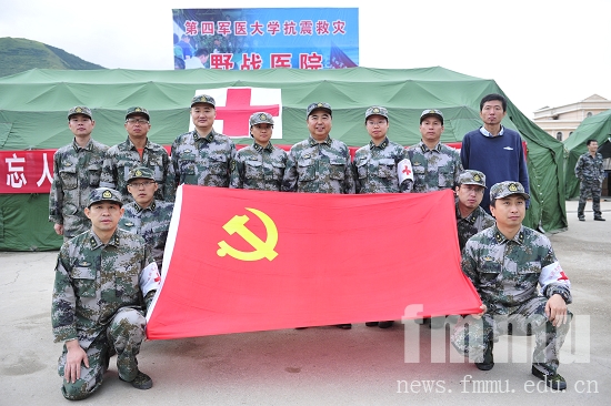 7月27日晚7时,在第四军医大学赴甘抗震救灾医疗队营地,黄树东、李维东、李家一、朱菲、谢乐、韩进武、李红安等7名医疗队员面对鲜红的党旗庄严宣誓,成为光荣的中共预备党员。