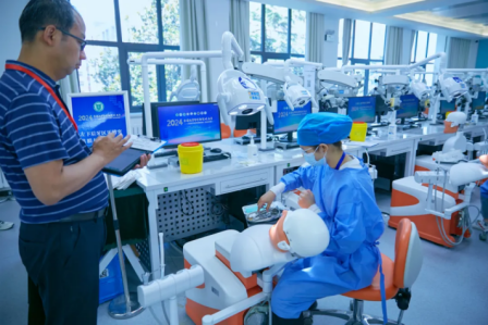 比赛精心设置了“II类洞制备术、牙槽突黏膜切口缝合术、全瓷冠牙体预备术、心肺复苏+AED急救技术”四个竞赛项目,同时结合信息化、数字化手段,应用导航式仿真训练系统、牙科仿真操作训练系统、客观化结果评估系统、无纸化考核评分系统等国内先进的教学评估手段,确保了比赛的公平性、公正性、客观性。选手们个个精神饱满,斗志昂扬,凭借扎实的理论基础、精湛的操作技艺和卓越的团队协作能力,尽现卓越风采。