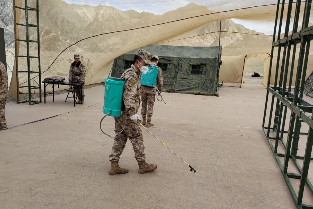 因训练场和营区地处野外,蚊虫多、卫生条件差,医护人员以防病菌、防蚊虫为工作重点,定期喷洒84消毒液及灭蚊喷剂,对日常环境进行消杀灭菌。