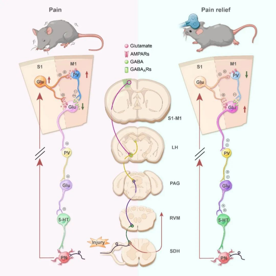 近年来,以初级运动皮层(M1)为核心的神经调控技术成为治疗顽固性慢性痛的前沿手段,M1也被认为是位于神经系统最高位的疼痛神经调控靶点。然而,感觉系统的痛觉敏化如何引起运动皮层的功能改变,运动皮层又是怎样调控疼痛的持续慢性化,一直悬而未解。针对这一前沿的科学问题,罗层/武胜昔教授团队发现,损伤或炎症导致的慢性痛状态下M1锥体神经元呈现显著的结构和功能可塑性下调,而这一功能下调源于初级感觉皮层(S1)-M1局部微环路的兴奋-抑制失衡所致。特异性调控M1脑区神经元可以明显改善炎症或损伤诱致的痛觉敏化。本研究提出了初级运动皮层调控慢性疼痛的非运动功能新思路,揭示了其下行调控痛感觉的环路新机制,为研发和优化靶向运动皮层治疗顽固性慢性痛的神经调控方案提供了重要科学依据和理论指导。