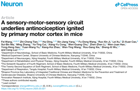 4月15日,大学基础医学院神经生物学教研室武胜昔/罗层教授团队在神经科学顶级期刊《Neuron》(神经元)在线发表题为“A sensory-motor-sensory circuit underlies antinociception ignited by primary motor cortex in mice”的研究论文。《Neuron》是Cell Press杂志社出版的《Cell》杂志的姐妹期刊,长期稳居学科影响力金字塔顶端,其发表的研究成果常被视为领域内的“金标准”,被国际学界视为神经科学领域最高学术荣誉的象征之一。该研究从感觉-运动互作的角度揭示了初级运动皮层调控慢性疼痛的环路新机制,阐明了重复经颅磁刺激(rTMS)靶向初级运动皮层的神经调控策略治疗慢性疼痛的细胞功能基础。