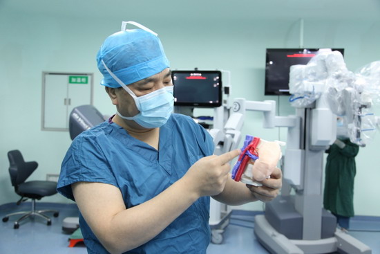 2017年12月25日9时,手术室内,泌尿外科张波副主任操控手术机器人,将左肾静脉游离到下腔静脉并充分松解狭窄处,将3D打印PEEK外支架套到左肾静脉上,小心地放入到腹主动脉和肠系膜上动脉的夹角处,这样就使得夹角增大,左肾静脉从支架管道中通过避免受压,血流即刻恢复畅通,手术仅用1个小时,就治好了困扰小斌一年的胡桃夹综合征。