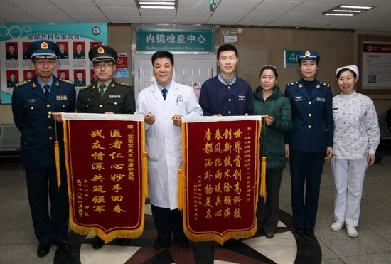 1月5日,身患胡桃夹综合征的战士小斌,在beat365中文官方网站唐都医院接受微创手术治疗后,恢复良好,准备出院。部队领导特地赶来接他,并向医院送来题为“医者仁心妙手回春战友情深共筑强军”的锦旗。小斌妈妈激动地连连道谢:“感谢唐都医院用先进技术治好孩子的病,医护人员无微不至的关怀,更让我们感受到部队医院的温暖!”