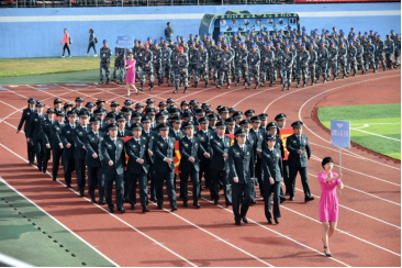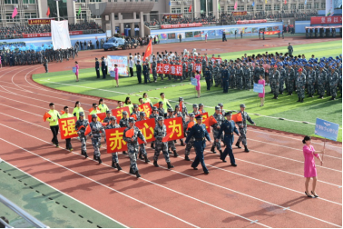 入场式上,会徽会标方队、红旗方队、高级专家方队、军官方队、文职人员方队、裁判员方队和15支代表队,伴着雄壮有力的《运动员进行曲》,迈着铿锵的步伐,洋溢昂扬的士气,依次通过主席台,赢得全场阵阵喝彩,充分体现出师生员工精诚团结、奋发拼搏的精神面貌,生动展示了追求卓越、争创一流的坚定信念。