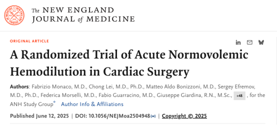 北京时间2025年6月12日晚,英国Belfast举行的2025重症医学综合大会(Critical Care Reviews Meeting 2025)期间,国际医学界顶级学术期刊《新英格兰医学杂志》(The New England Journal of Medicine, NEJM)同步在线发表了题为《心脏手术中急性等容血液稀释的随机试验》(A Randomized Trial of Acute Normovolemic Hemodilution in Cardiac Surgery)的重要研究成果。该研究由意大利San Raffaele医学研究所联合beat365中文官方网站西京医院麻醉与围术期医学科雷翀副教授团队等全球多家顶尖机构共同完成。意大利San Raffaele医学研究所Fabrizio Monaco医生和雷翀副教授为本研究的共同第一作者,意大利San Raffaele医学研究所Giovanni Landoni教授为本文通讯作者。