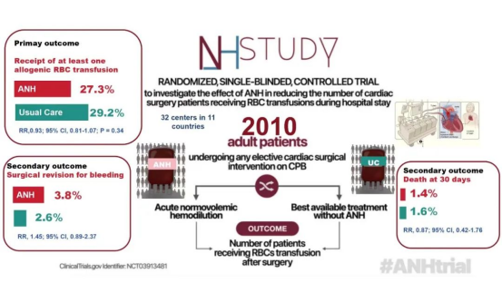 为解决这一危重患者围术期管理的重要科学问题,全球多个顶尖心脏中心联合开展了一项大规模国际多中心随机对照试验,覆盖全球11个国家32个医疗中心,共纳入2010例接受心脏手术的患者。研究旨在系统评估ANH策略在减少心脏手术患者异体输血需求方面的有效性与安全性,并得出关键性结论:实施ANH并未降低心脏手术患者对异体红细胞输注的需求,也未能减少术后出血量。值得关注的是,研究同时证实ANH并未增加患者不良事件的发生率。这一发现直接挑战了当前国际指南的推荐意见,为全球心脏手术围术期血液管理实践提供了极具价值的高等级循证医学证据和重要临床指导。