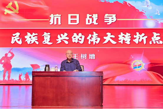 王树增老师以《抗日战争:民族复兴的伟大转折点》为授课主题,从“中国共产党是抗日战争的中流砥柱”,“抗日战争是全民族的抗战”,“抗日战争是民族复兴的伟大转折点”三个方面展开,以开阔宏大的历史视角、严谨详实的文献考证和鲜活生动的语言叙事,呈现了中国人民抗日战争的恢弘画卷,深刻阐释了抗日战争伟大胜利的深远意义、宝贵启示和中国共产党在抗日战争中的中流砥柱作用。