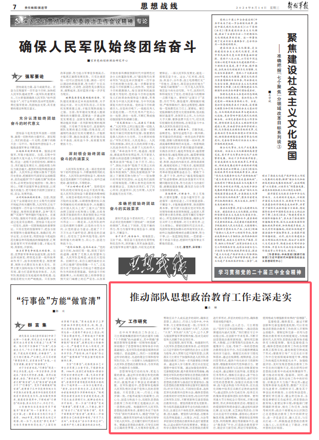 守正创新,注入活力。习主席指出:“坚持守正和创新相统一,推动思政课建设内涵式发展。”我们要在守正中站稳立场,在创新中寻求变革,不断开创思想政治教育新局面。要利用互联网、大数据、云计算等现代信息技术,构建集学习、交流、考核于一体的思想政治教育信息化平台,为官兵提供便捷高效的学习途径。根据官兵的学习情况和需求,通过在线课程、视频讲座、互动问答等形式,提供个性化的学习资源和推荐,增强教育的时代性和感召力。要将思想政治教育与实战化训练紧密结合起来,通过模拟实战环境、设置复杂任务等形式,锤炼官兵意志;善于结合任务执行过程中的实际情况,进行有针对性的思想教育,加强官兵的战斗精神、战斗意志和战斗作风培养,在实战化训练中培养官兵敢打必胜的血性胆气;通过团队合作完成任务,培养官兵的集体荣誉感和团队协作精神。要利用重大节日和纪念日等时机,开展主题鲜明、形式多样的教育活动,增强官兵的爱国情怀和使命意识;通过组织演讲比赛、征文比赛、文艺演出等活动,引导官兵在追寻历史根脉、感悟初心使命中触及灵魂、鼓舞精神。要借助信息网络优势,利用微博、微信等新媒体平台,建立“微思政”平台,打造政治教育新平台、理论学习新空间、舆论引导新阵地,使网络成为增强教育效果的“倍增器”。