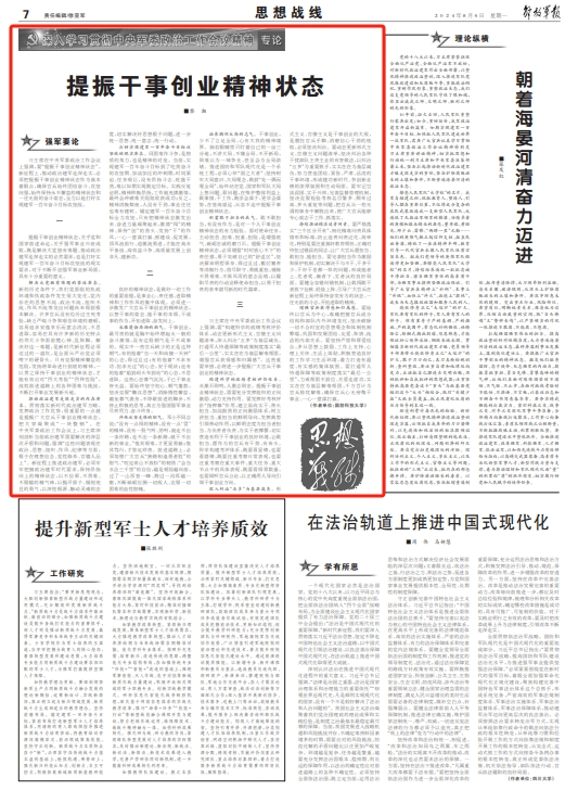 习主席在中央军委政治工作会议上强调,要“提振干事创业精神状态”。新征程上,推动政治建军走深走实,必须把提振干事创业精神状态作为基本着眼点,确保官兵始终团结奋斗、攻坚向强,始终保持永不懈怠的精神状态和一往无前的奋斗姿态,全力以赴打好实现建军一百年奋斗目标攻坚战。
