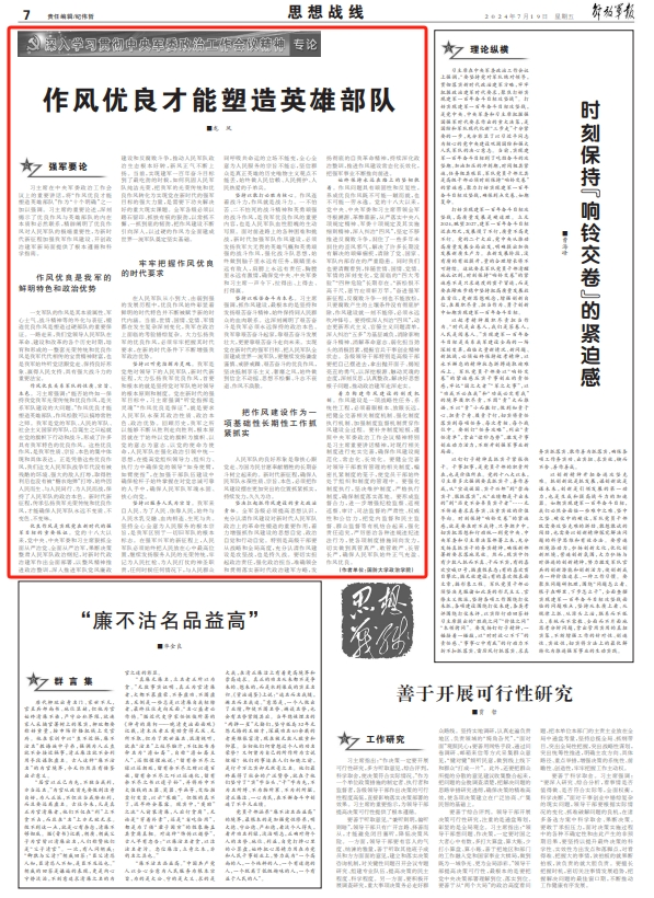 一支军队的作风是其本质属性、军心士气、战斗精神等的外化与表征,锻造优良作风是塑造过硬部队的重要保证。一路走来,我们党领导人民军队在革命、建设和改革的各个历史时期,培育和形成的一整套光荣传统和优良作风是我军代代相传的宝贵精神财富,也是我军始终听党话跟党走、保持良好形象、赢得人民支持、具有强大战斗力的重要法宝。