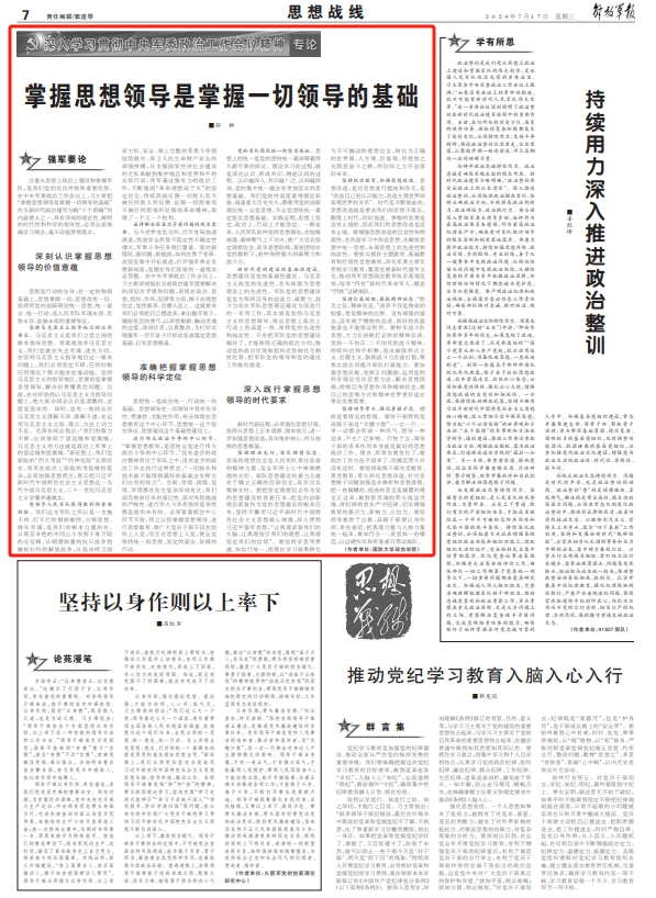 思想统一是政治统一、行动统一的基础。思想领导在一切领导中具有先导性、贯通性、支配性作用,充分体现在思想教育这个中心环节、思想统一这个坚实保证、思想建设这个基础性建设上。