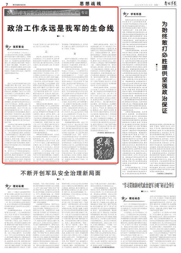 在中央军委政治工作会议上,习主席站在时代和全局高度,深刻阐明新时代政治建军方略内涵要义,“明确政治工作永远是我军的生命线”是其中重要一点,为加强军队党的领导和党的建设、深入推进政治建军指明了前进方向,提供了根本遵循。我们要深入学习贯彻习主席重要讲话精神,坚持从思想上政治上组织上建设和掌握部队,切实把政治工作威信牢固立起来,为强军事业提供坚强政治保证。