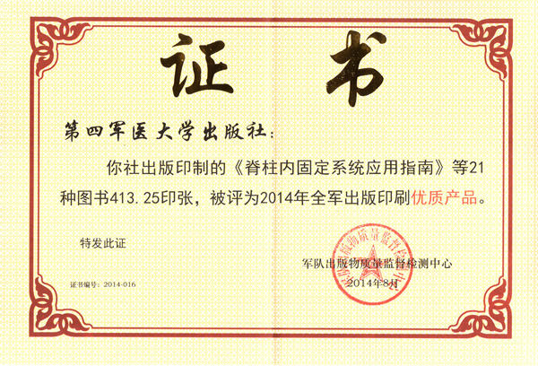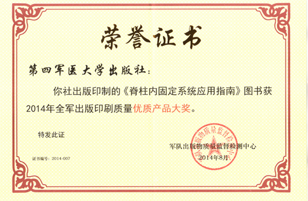 在军队出版社2014年度图书质量检查评比活动中,我社报送的21种图书全部荣获“2014全军出版印刷优质产品”奖。其中《脊柱内固定系统应用指南》一书荣获2014全军出版印刷质量最高奖――“优质产品大奖”。