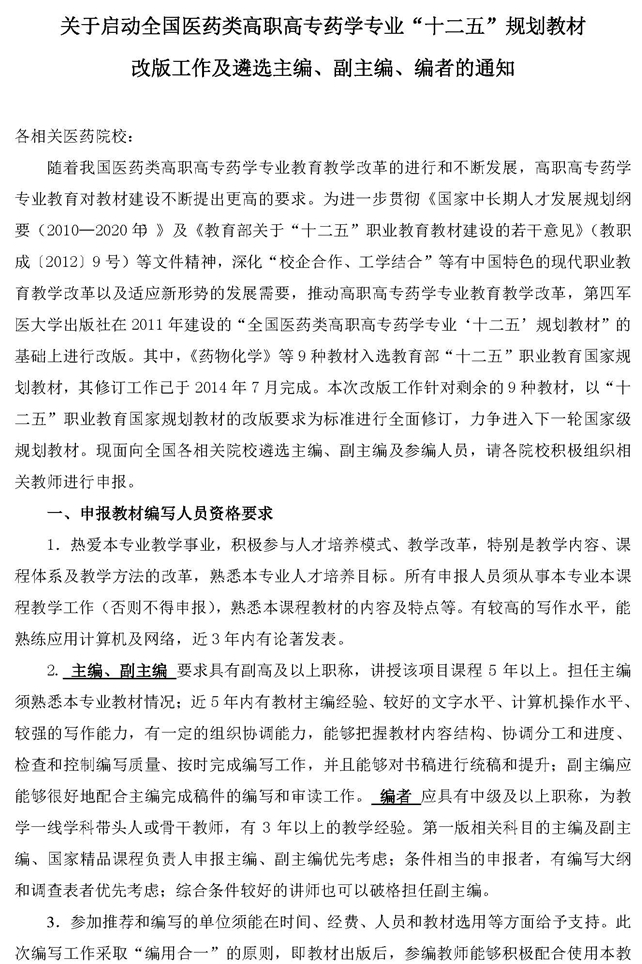 关于启动全国医药类高职高专药学专业“十二五”规划教材改版工作及遴选主编、副主编、编者的通知
