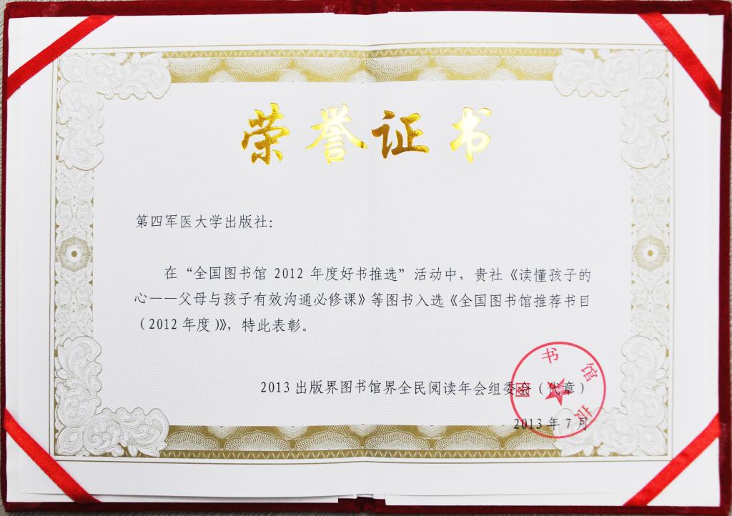 我社选送的图书《读懂孩子的心――父母与孩子有效沟通必修课》、《儿科护理技术》、《儿童营养与保健》、《心智最大――成熟比成功更重要》、《从心出发――老年人快乐生活12课》成功入选《全国图书馆推荐书目(2012年度)》,并获得2013年出版界图书馆界全民阅读年会组委会颁发的荣誉证书。