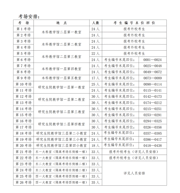 7.疫情原因,不安排提前查看考场,考场安排如下,调整至隔离考场的考生安排见《隔离考场人员安排》(附件3)。