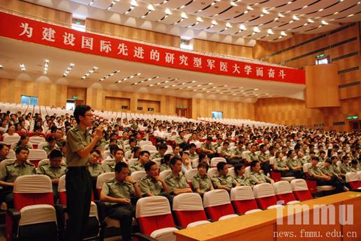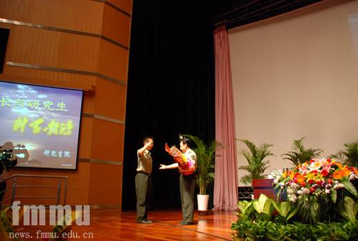 7.研:尊敬的樊校长你好,我是08硕士队新生郑霄鹏。我有两个问题想问你,第一个问题,我的本科是就读于上海的第二军医大学,当我以新生的身份站在校园的时候,很多人会说,你为什么报考第四军医大学?我的回答是这样的,我说我看重这里浓厚的、严谨的科研风气,以及优秀的导师队伍,通过今天您刚才的讲话,我想增加一点,那就是most important of all is moneywhy?刚从您讲话中知道,咱们学校的科研经费可以说是跃居三个军医大学之首,那么,我的第一个问题就是想问一下您,您将会在宏观上采取什么政策来调控这些资金的运用,以让它达到最有效的作用。