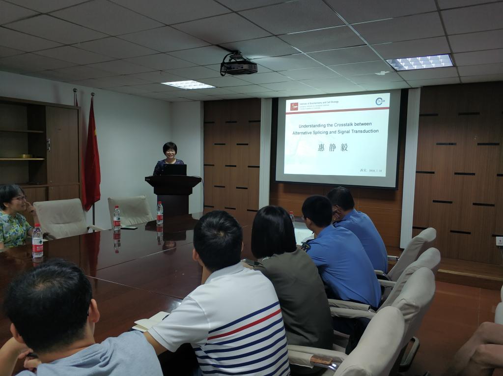 2018年7月10日,药学系生物制药教研室邀请中科院上海生化与细胞所惠静毅教授来beat365进行学术交流,并做了题为“Understanding the crosstalk between alternativesplicing and signal transduction”的专题学术报告。会议由卢兹凡教授主持,药学系部分教员及研究生参加了学术会议。报告中,惠静毅教授介绍了他的研究团队近年来在选择性剪接方面的研究工作。报告结束后,惠静毅教授与大家进行了热烈的讨论,双方建立了良好的合作意向。