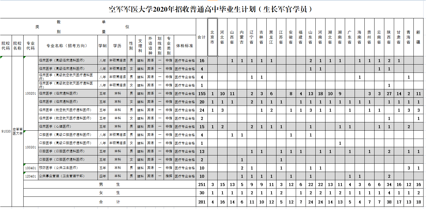 2020年招收普通高中毕业生计划(生长军官学员)