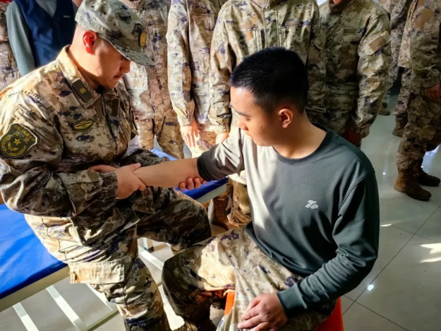 针对运动损伤疾病和官兵训练伤规律,采用坐位脊椎旋转复位等新医正骨手法,为战友们解决颈肩痛、腰椎滑脱、软组织损伤、腰肌劳损等病痛,还为驻地干休所的老战友们的脊柱退行性病变给予了治疗调适和保养建议。