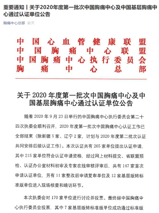 9月23日,接中国胸痛中心总部文件通知,唐都医院胸痛中心顺利通过2020年度第一批次国家胸痛中心认证,成为西北地区首家通过国家认证的军队医疗机构。