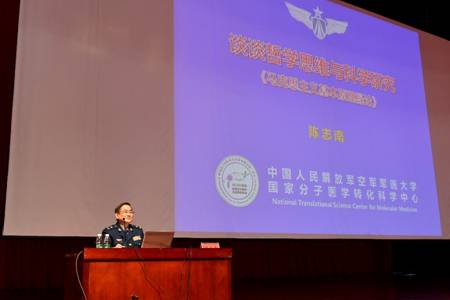 此次授课,陈院士以《哲学思维与科学研究》为主题, 结合个人成长经历、学科发展历程特别是新冠药物研发实践,从哲学与哲学思维、哲学素养与科学价值观、哲学理念与科学思维、科学实践与哲学原理、坚持科学辩证唯物主义五个方面,对如何学哲学用哲学培育科学价值观、培养科学思维、提升科研创新意识和能力做了深度阐释,寄语青年学子要把个人理想同国家、民族和军队的发展统一起来,珍惜美好时光,求知报国、精武强能,努力成为高素质新型军事医学人才。课后,陈院士还就理想选择、科研方向、医学伦理等话题与学员展开了热烈的互动交流。