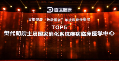 颁奖环节,樊代明院士荣获2022百度健康年度科普传播奖,该奖项全国共10人获奖。根据百度搜索引擎上的检索数据进行统计排名,樊院士及其领衔的国家消化系统疾病临床医学研究中心位居全国第五名,也是10名获奖者中唯一的院士。这是继去年樊院士荣获2021百度健康年度科普传播奖和中国科协全民科学素质工作先进个人称号后,在科普传播领域取得的又一殊荣。