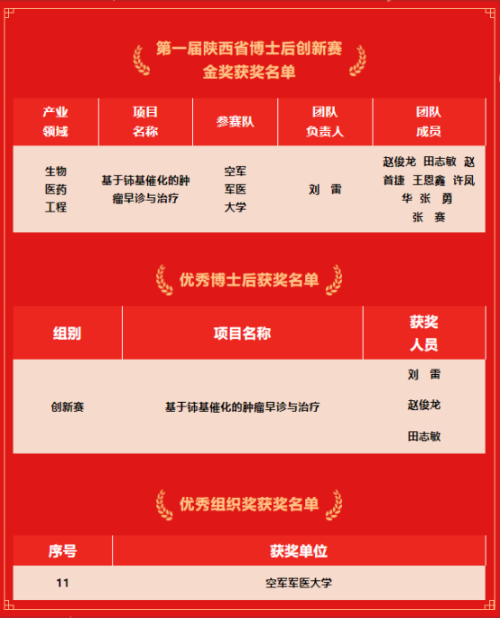 近日,第一届陕西省博士后创新创业大赛获奖名单公布,beat365博士后刘雷领衔团队获生物医药工程领域唯一金奖,团队负责人刘雷及成员赵俊龙、田志敏获“陕西省创新创业优秀博士后”,大学获“优秀组织奖”。