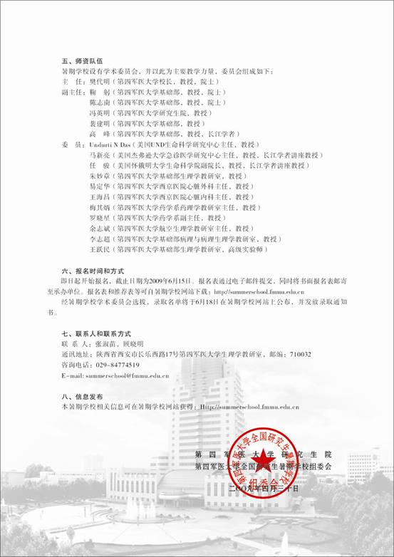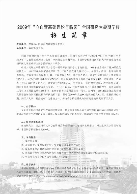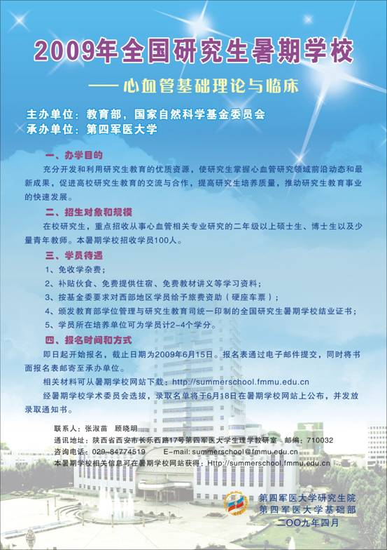 由教育部和国家自然科学基金委员会共同主办,第四军医大学研究生院和第四军医大学基础部生理学教研室具体承办的“2009年全国研究生暑期学校(心血管基础理论与临床)”自即日起开始接受报名,本暑期学校开班时间为2009年7月7日至7月18日,报名截止时间为2009年6月15日。